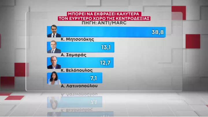 Παράλληλα, ο πρωθυπουργός έχει ευρύ προβάδισμα σχετικά με την ηγεσία στον χώρο της κεντροδεξιάς. Συγκεκριμένα, το 38,8% των πολιτών θεωρεί ότι είναι καταλληλότερος για να εκφράσει τον συγκεκριμένο χώρο, με μεγάλο προβάδισμα από τον δεύτερο Αντώνη Σαμαρά που συγκεντρώνει 13,1%. Τρίτος είναι ο Κυριάκος Βελόπουλος με 12,7% και τέταρτη η Αφροδίτη Λατινοπούλου με 7,1%.