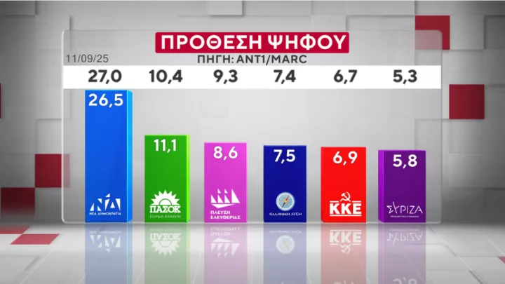 Στην πρόθεση ψήφου, η ΝΔ συγκεντρώνει 27%, το ΠΑΣΟΚ 10,4%, η Πλεύση Ελευθερίας 8,6%, η Ελληνική Λύση 7,5%, το ΚΚΕ 6,9, ο ΣΥΡΙΖΑ 5,8% και ακολουθεί η Φωνή Λογικής με 3,1%.