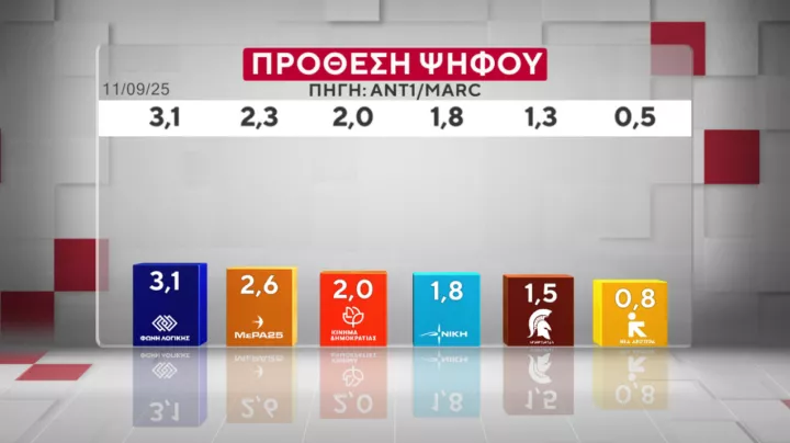 Συγκεκριμένα, στην εκτίμηση ψήφου η Νέα Δημοκρατία καταγράφει ποσοστό 30,5%, με το ΠΑΣΟΚ να βρίσκεται στη δεύτερη θέση με 14%. Ακολουθούν Πλεύση Ελευθερίας με 10,8%, Ελληνική Λύση με 9,5%, ΚΚΕ με 8,4%, ΣΥΡΙΖΑ με 7%, Φωνή Λογικής με 3,8% και ΜέΡΑ25 με 3,2%.