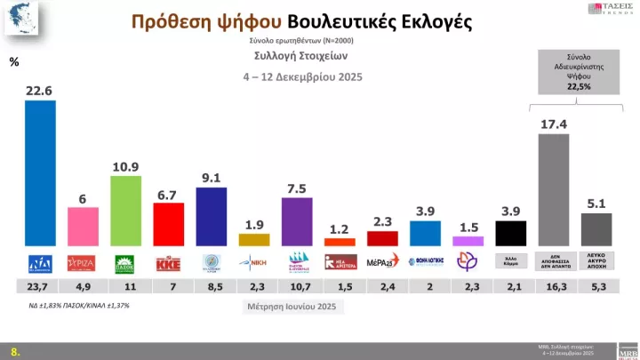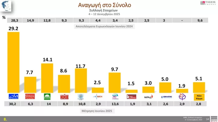 Υπερδιπλάσια είναι η διαφορά της Νέας Δημοκρατίας (29,2%) στις Τάσεις της MRB από το δεύτερο ΠΑΣΟΚ (14,1%) στην εκτίμηση ψήφου, ενώ το κυβερνών κόμμα είναι στο 44% όσον αφορά στην παράσταση νίκης.