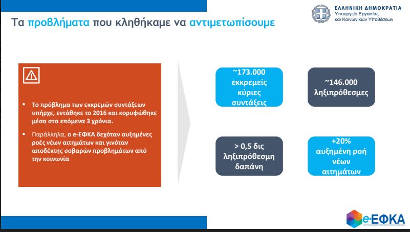 Το πρόβλημα υπήρχε διαχρονικά, οξύνθηκε ωστόσο από την ίδρυση του ΕΦΚΑ το 2016 και εντάθηκε σταδιακά. Είναι ενδεικτικό πως το καλοκαίρι του 2019 οι συνολικές εκκρεμείς ασφαλιστικές και συνταξιοδοτικές υποθέσεις ξεπερνούσαν το 1 εκατομμύριο. Επιπλέον, πάνω από 30.000 φάκελοι ήταν ξεχασμένοι σε υπόγεια και αποθήκες του Φορέα χωρίς κανένας να γνωρίζει την ύπαρξη τους. Οι οφειλές της Πολιτείας σε καθυστερούμενες συντάξεις άγγιζαν το μισό δισεκατομμύριο ευρώ, οι πολίτες ήταν ευλόγως αγανακτισμένοι, με έναν ΕΦΚΑ σε κατάσταση πλήρους αποδιοργάνωσης.
