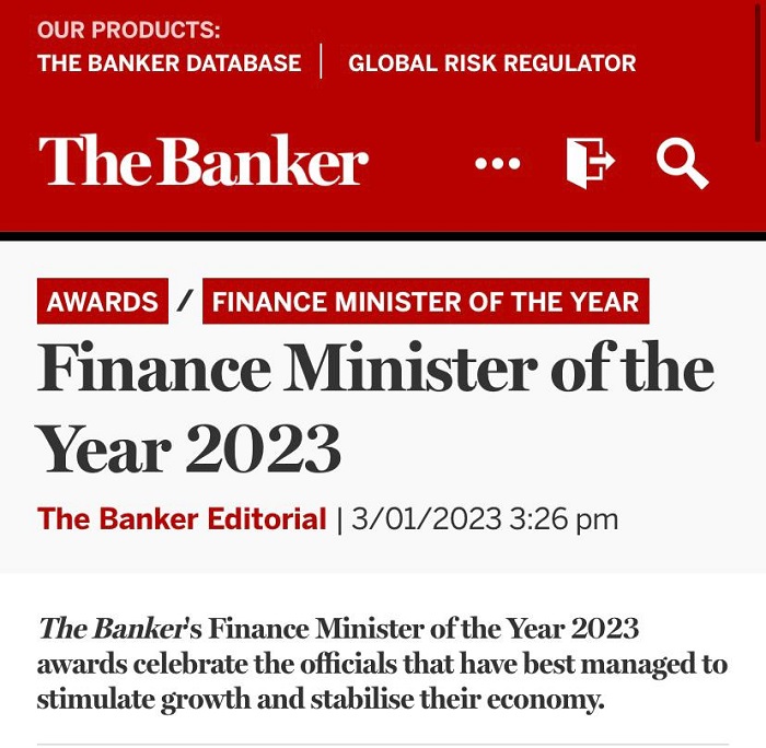 «Η σημερινή βράβευσή μου ως υπουργός Οικονομικών της Χρονιάς 2023 για την Ευρώπη, από το περιοδικό "The Banker" του ομίλου των "Financial Times", αποτελεί ξεχωριστή τιμή.
