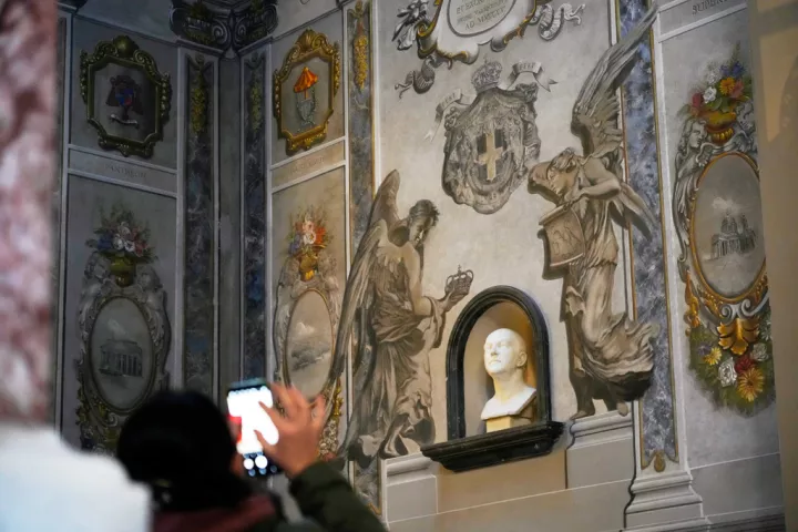 Μια γυναίκα φωτογραφίζει μια ανακαινισμένη τοιχογραφία στη μνήμη του αείμνηστου βασιλιά της Ιταλίας Ουμβέρτου Β', που απεικονίζει αγγέλους, μέσα στη Βασιλική του Αγίου Λαυρεντίου στη Λουκίνα της Ρώμης, την Κυριακή 1 Φεβρουαρίου 2026. (AP Photo/Gregorio Borgia)