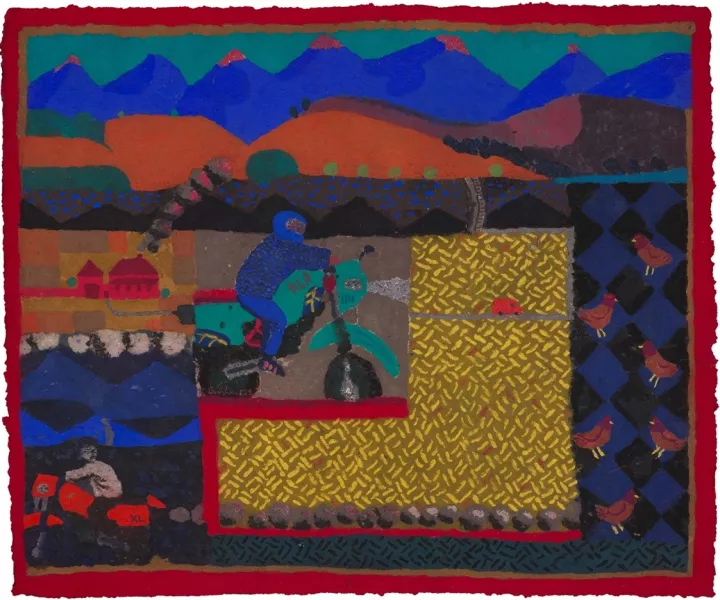 Σε αυτήν τη γραμμή, αλλά με άλλους όρους, κινείται και ο Γιάννης Ευθυμίου. Ο χαρτοπολτός, με την αδρή του υφή, αντικαθιστά τον μετωπικό χειρισμό του Κόντογλου με μια υλικότητα εξίσου αποκαλυπτική. Η σύνθεση δομείται επάνω σε διαδοχικές χρωματικές ζώνες, οι οποίες υποκαθιστούν την κλασική προοπτική. Όπως στον Κόντογλου το βουνό υψώνεται σαν ιερό σύμβολο, έτσι και στον Ευθυμίου το βουνό επανέρχεται ως μοτίβο-τοτέμ: μνήμη και καταφυγή μαζί. Η ελληνική γη μεταμορφώνεται σε σκηνή όπου παίζεται ο διάλογος ανάμεσα στον μύθο και το βίωμα.