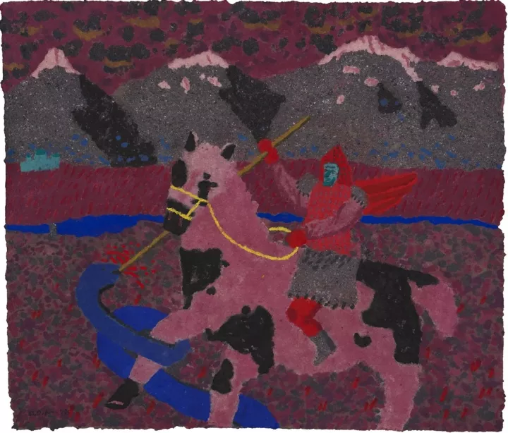 Μέσα σε αυτόν τον κόσμο, «ζωντανοί» εμφανίζονται οι καβαλάρηδες. Άλλοτε πάνω σε άλογο, άλλοτε καβάλα σε μοτοσυκλέτα, οι μορφές αυτές μπαίνουν στη ζωγραφική σαν αδέσποτοι ήρωες. Η μηχανή γίνεται άλογο, το άλογο μηχανή. Είναι εικόνες μυθικές και καθημερινές μαζί: οι καβαλάρηδες της παιδικής φαντασίας, οι μοτοσυκλετιστές που αφήνουν τον κόσμο πίσω τους κι ανοίγουν δρόμο στο άγνωστο, οι φιγούρες που επιστρέφουν στην ανάμνηση σαν φαντάσματα. Ανάμεσά τους κι ο καβαλάρης που ορμά με το δόρυ του εναντίον του δράκου, επαναφέροντας μιαν εικονογραφία αιώνων: τον άγιο Γεώργιο, τον μάρτυρα-στρατιώτη, τον νικητή του κακού.