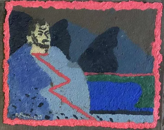 Ανάμεσα στα έργα του εργαστηρίου, ξεχωρίζω το πρόσωπο του ζωγράφου. Σ’ αυτήν την ιδιότυπη αυτοπροσωπογραφία, ο Ευθυμίου δεν αναζητά την ομοιότητα· δεν τον ενδιαφέρει το πορτρέτο, αλλά η παρουσία. Το πρόσωπο μοιάζει να αναδύεται μέσα από το ίδιο το βουνό, σαν να είναι η μορφή και το τοπίο μία ουσία. Το κόκκινο ίχνος που τέμνει τη σύνθεση μοιάζει με ρωγμή μνήμης, με πληγή που ενώνει και χωρίζει, που φανερώνει το αδιόρατο βάρος της ύπαρξης.