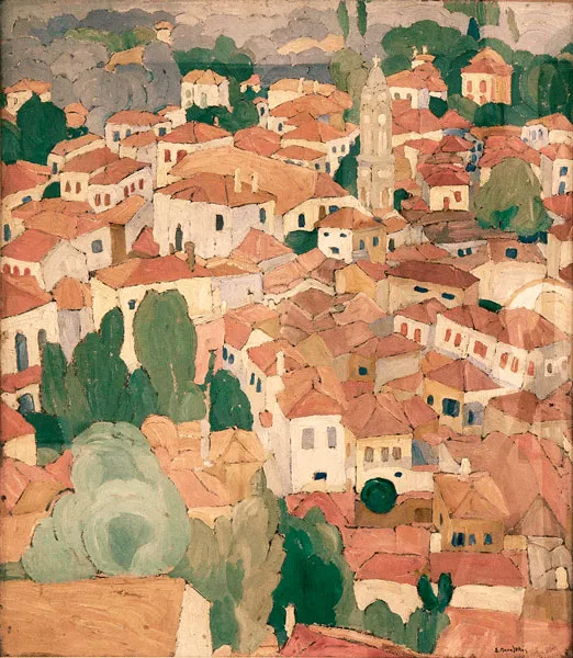 Σπύρος Παπαλουκάς, «Κόκκινες στέγες στη Λέσβο», Δημοτική Πινακοθήκη Ρόδου