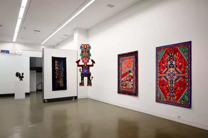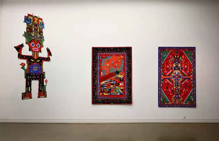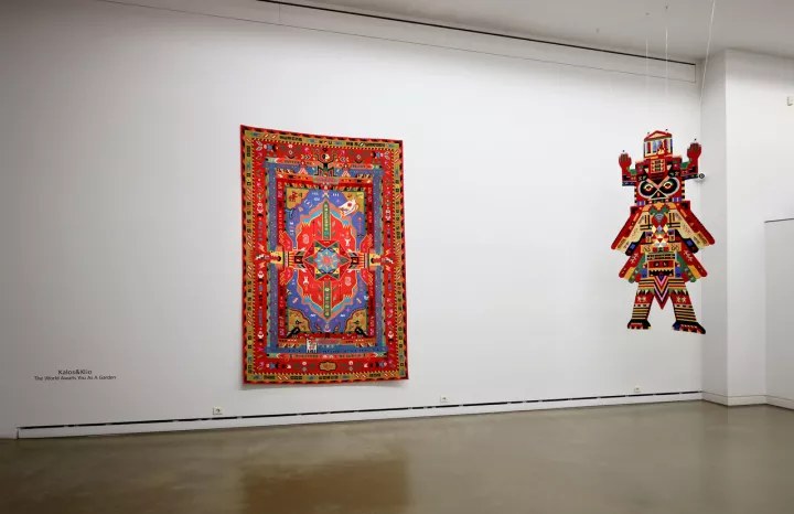 Τους γνώρισα στη Θεσσαλονίκη, στο πλαίσιο του φεστιβάλ κινηματογράφου, και σκεφτόμουν πόσο ήθελα να δω δουλειά τους στην Αθήνα. Οι Kalos&Klio, ο Κωνσταντίνος Καλλιτσάκης και η Κλειώ Καλογήρου, κουβαλούσαν ήδη τότε μια φρεσκάδα που δεν παριστάνει τον πειραματισμό ούτε τον επικαλείται ως άλλοθι. Μια δουλειά με συνοχή, δουλεμένη στον χρόνο και όχι στο εφέ. Έχοντας το χαλί για καμβά, το καλλιτεχνικό δίδυμο παρουσιάζεται στην γκαλερί Kalfayan, στη Χάρητος με μια σειρά πολύχρωμων χαλιών. Κρεμαστά υφαντά που κουβαλούν μνήμη, κόπο κι αφήγηση, θυμίζοντας ότι η τέχνη μπορεί ακόμη να γεννιέται από το νήμα και τον ρυθμό των χεριών.