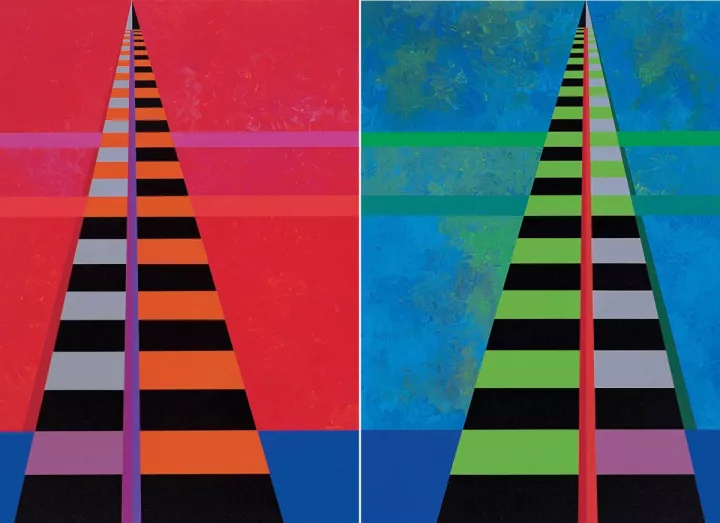 Όπυ Ζούνη, «Δρόμοι σε ανάκλαση» (1972-1992, ακρυλικό σε καμβά και ξύλο, 181 x 157 εκ.). Ιδιωτική Συλλογή. Φωτ.: Ευγενική παραχώρηση Αλέξανδρου Ζούνη