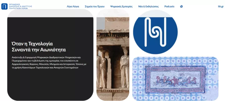 Εφαρμόζονται πιλοτικά καινοτόμες εφαρμογές Επαυξημένης και Εικονικής Πραγματικότητας (AR/VR) σε εμβληματικούς αρχαιολογικούς χώρους, όπως η Αρχαία Ολυμπία, η Δήλος, η Αρχαία Αγορά, η Ροτόντα Θεσσαλονίκης, το Σούνιο και το Ασκληπιείο Κω, επιτρέποντας την ψηφιακή αναπαράσταση μνημείων και ιστορικών φάσεων που δεν είναι πλέον ορατές.