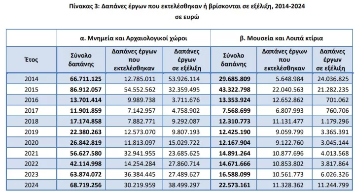 Άξιο αναφοράς ότι το 2024 δόθηκαν οι περισσότερες, σε βάθος δεκαετίας, συνολικές δαπάνες έργων που αφορούν έργα σε μνημεία και αρχαιολογικούς χώρους. Πρόκειται για το ποσό των 68.719.256 ευρώ, που αντιστοιχεί σε αύξηση κατά 7,6% σε σύγκριση με το προηγούμενο έτος. Από αυτό το ποσό, τα 20.084.043 δόθηκαν για αρχαία μνημεία και αρχ. χώρους, τα 33.899.965 σε βυζαντινά-μεταβυζαντινά μνημεία και αρχ. χώρους και τα 14.735.249 σε νεότερα μνημεία.