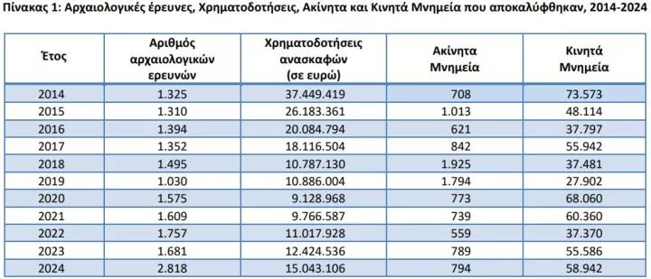 Ειδεμή για τις αρχαιολογικές έρευνες στις οποίες και αναφερόμαστε, κατά το 2024 ανήλθαν σε 2.818 και η χρηματοδότησή τους σε 15.043.106 ευρώ, έναντι 1.681 ερευνών και 12.424.536 ευρώ κατά το 2023, σημειώνοντας αύξηση 67,6% και 21,1%, αντίστοιχα. Πρόκειται για τον μεγαλύτερο αριθμό αρχαιολογικών ερευνών που έχουν διενεργηθεί σε βάθος δεκαετίας καθώς και τη μεγαλύτερη χρηματοδότηση που έχει δοθεί την τελευταία επταετία, όπως προκύπτει από τα αποτελέσματα της έρευνας Εφορείας Αρχαιοτήτων τα οποία ανακοίνωσε η Ελληνική Στατιστική Αρχή (ΕΛΣΤΑΤ).