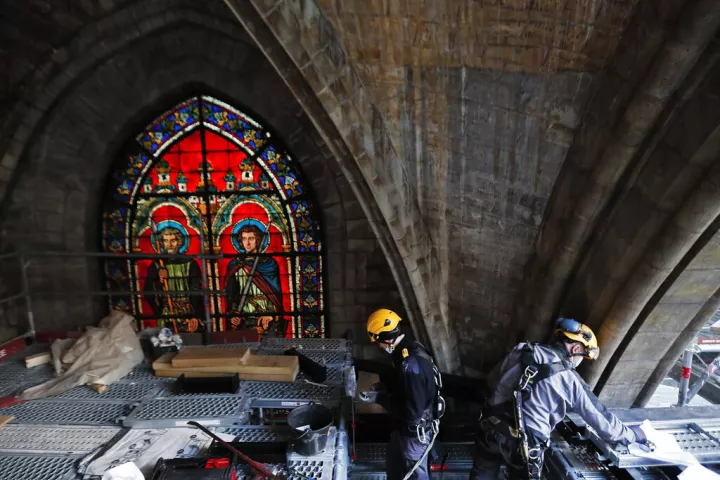 Εργάτες κοντά σε ένα βιτρώ κάτω από θόλους στο εργοτάξιο ανακατασκευής της Notre Dame στο Παρίσι, Πέμπτη 15 Απριλίου 2021. (Ian Langsdon, Pool via AP)