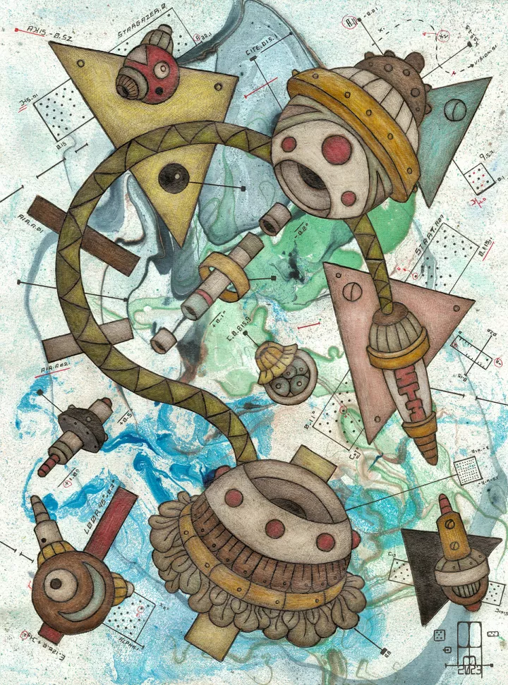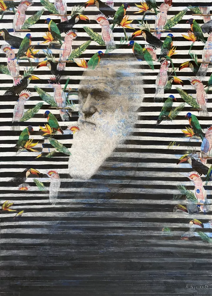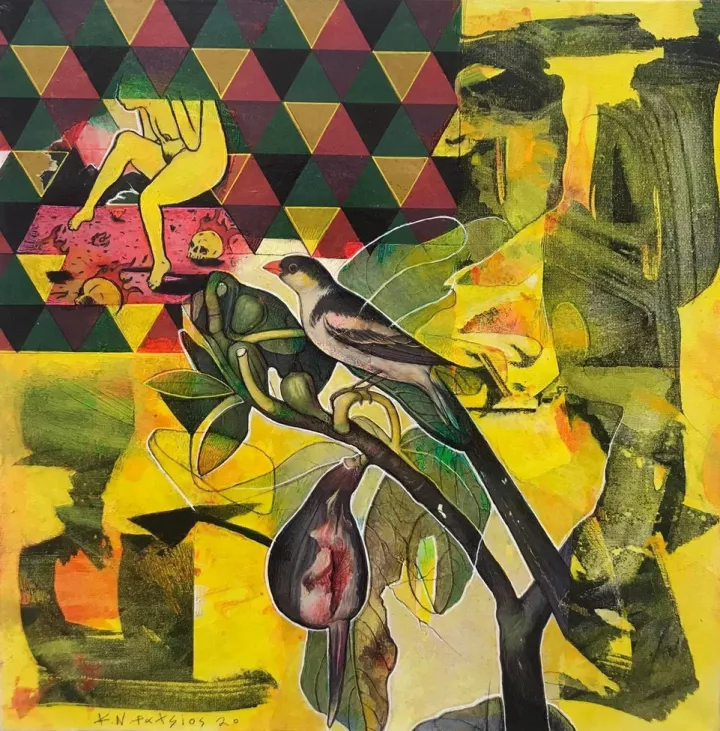 Κωνσταντίνος Πάτσιος, «The Breeder» (2025, ζωγραφική και κολάζ σε καμβά, 50x70 εκ.)