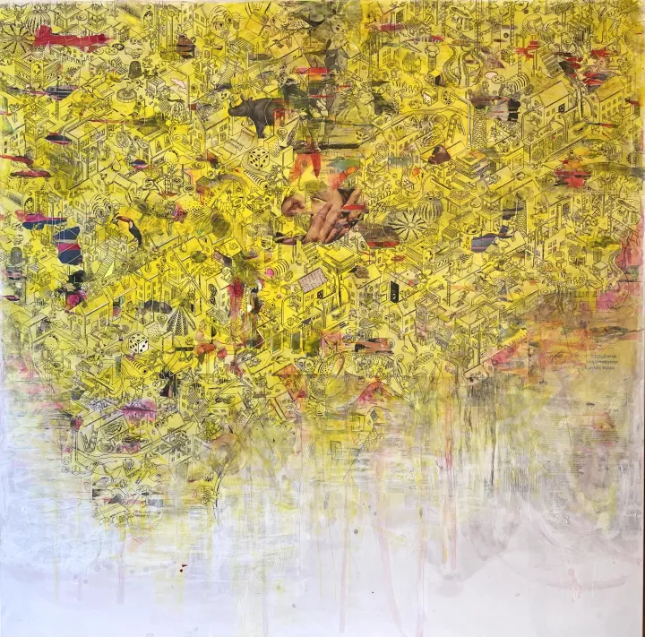 Κωνσταντίνος Πάτσιος, «Fragile communities» (2025, ζωγραφική και κολάζ σε καμβά, 60 x 60 εκ.). Ευγενική παραχώρηση της Alma Contemporary Art Gallery