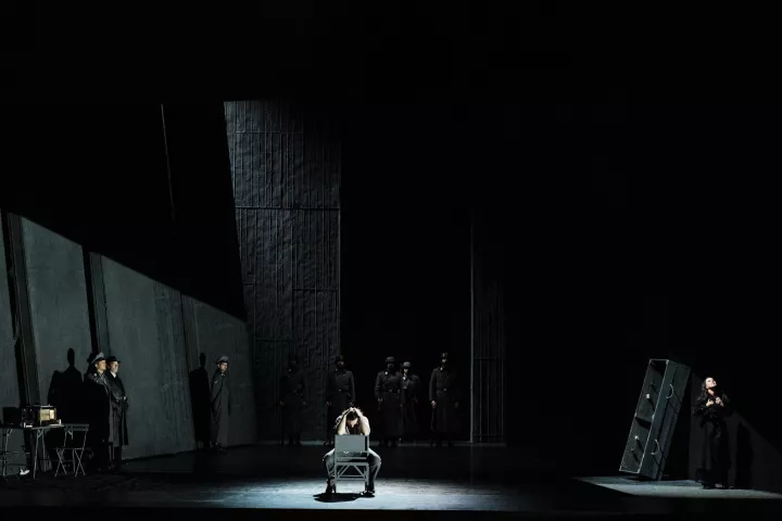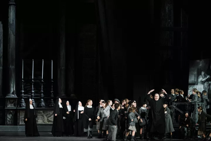 Οι λέξεις «Roma 1944» επάνω σε μία φωτογραφία από τη φασιστική Ιταλία καλωσορίζουν το κοινό στην πρεμιέρα (27/11) της όπερας «Τόσκα» στην Εθνική Λυρική Σκηνή, προτού ξεκινήσει η αφήγηση. Παράλληλα με μουσική υπόκρουση εκείνης της περιόδου, στη φωτογραφία παρεμβάλλονται τα ονόματα συντελεστών της όπερας, με τον ίδιο τρόπο σαν να επρόκειτο για τους τίτλους αρχής μίας ταινίας. Κι αν η «Τόσκα» που παρακολουθήσαμε δεν ήταν ακριβώς ταινία, παραπέμπει σε εκείνες του ιταλικού νεορεαλισμού και συγκλίνει σε φιλμ νουάρ χάριν της ασπρόμαυρης αισθητικής της παραγωγής και των υποβλητικών φωτισμών για τις ανάγκες του ιστορικού χρόνου: η υπόθεση μεταφέρεται σε μια Ρώμη παρωδία «Ανοχύρωτης Πόλης», τον Φεβρουάριο του 1944.