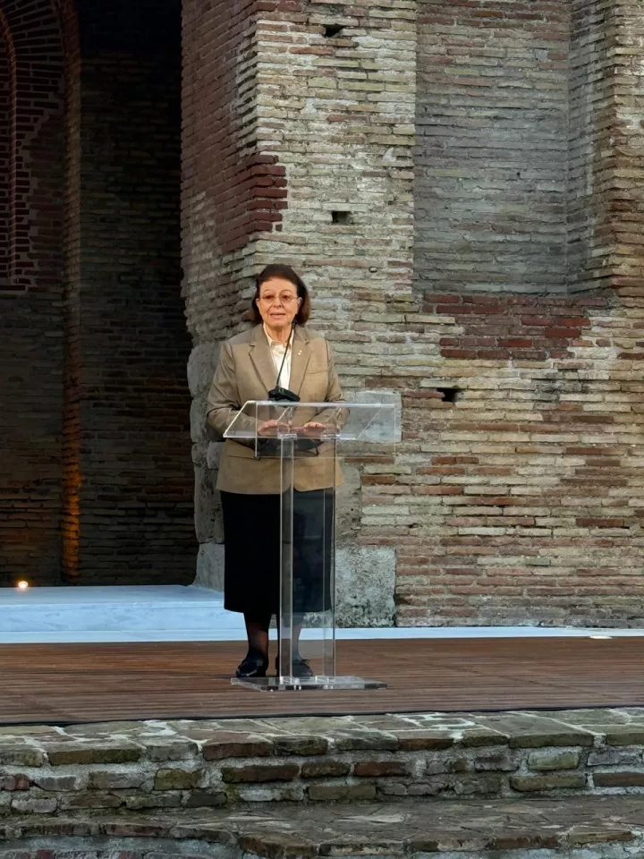 Η υπουργός Πολιτισμού, Λίνα Μενδώνη, στα εγκαίνια του έργου ανάδειξης, αποκατάστασης, συντήρησης, διαμόρφωσης περιβάλλοντος χώρου και φωτισμού του Ρωμαϊκού Ωδείου. Πηγή φωτ.: ΥΠΠΟ