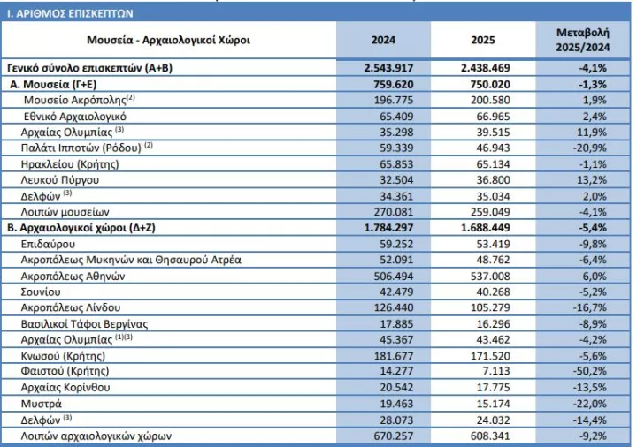 Στους αρχαιολογικούς χώρους, κατά το ίδιο οκτάμηνο, παρατηρείται μείωση κατά 4,6%, σε σχέση με την αντίστοιχη περίοδο του έτους 2024 στον αριθμό επισκεπτών, αύξηση κατά 4,8% στους επισκέπτες ελεύθερης εισόδου και κατά 39,9% στις αντίστοιχες εισπράξεις.