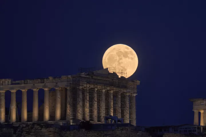 Νυχτερινή λήψη της Ακρόπολης Αθηνών κατά την «πανσέληνο της φράουλας», Ιούνιος 2025. Πηγή: AP Photo/Petros Giannakouris