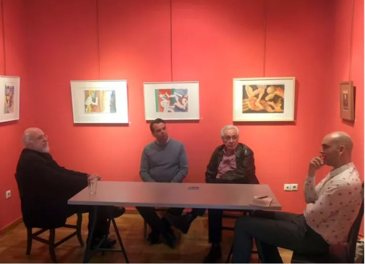 Στιγμιότυπο από τη συνέντευξη που παραχωρήθηκε στον πρώτο όροφο της γκαλερί Σκουφά. Από αριστερά οι Δ. Σαββόπουλος, Γ. Καλλιγάς, Α. Κυριτσόπουλος και ο Γ. Μυλωνάς @ Άννα Χασανάκου