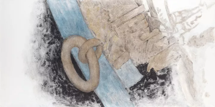 Σωτήρης Σόρογκας, λεπτομέρεια απο ρημαγμένο καΐκι. Ακρυλικό και κάρβουνο σε καμβά, 90x180 εκ., 2024