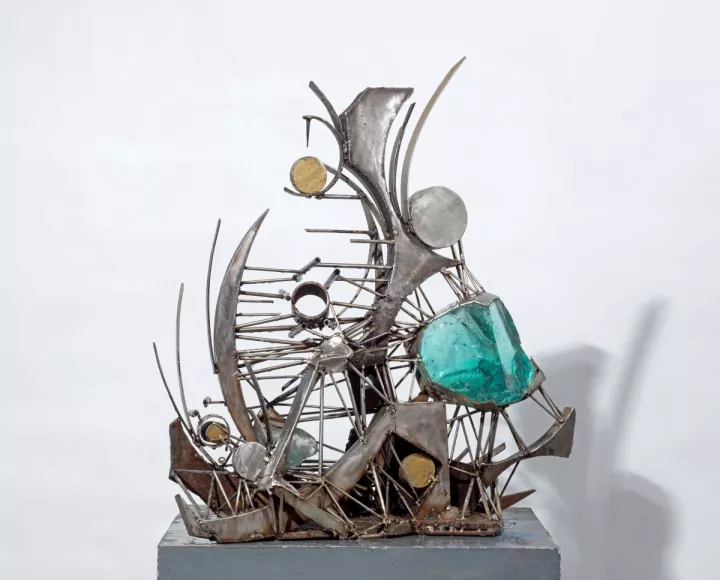 Γιώργος Χουλιαράς, «Μυθολογικό» (2020, ανοξείδωτο ατσάλι, υαλόμαζα, σίδηρος)