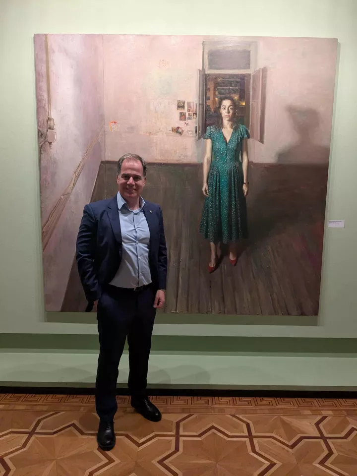Ο συλλέκτης Δάνης Κοτζαϊβάζογλου δίπλα από το πορτραίτο της Ε.Σ., αλλιώς «Πράσινη νύχτα» του Γιώργου Ρόρρη