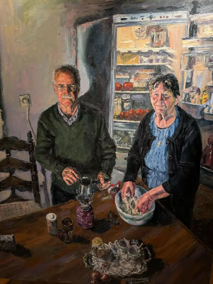 Στο διπλό πορτραίτο του Δημήτρη Αγγελόπουλου - από τους νεότερους ζωγράφους της συλλογής - απεικονίζονται ο παππούς και η γιαγιά του καλλιτέχνη και έχει τίτλο Το πρωινό τους