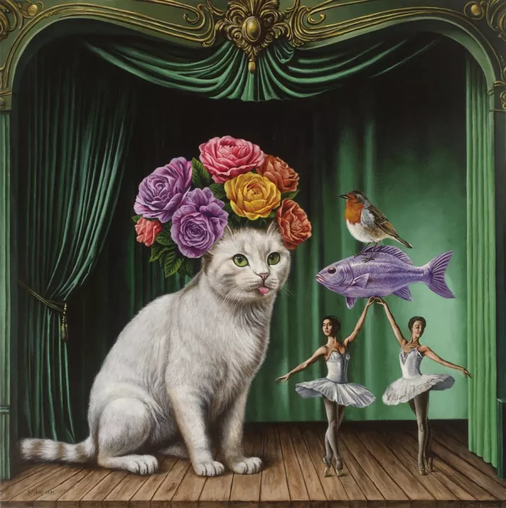 Η ζωγραφική αυτή γνωρίζει καλά πως το μάτι αναζητά την απόλαυση. Και ακριβώς εκεί το δοκιμάζει. Η επιφάνεια είναι φροντισμένη, τα χρώματα πλακάτα, pop κι απατηλά φωτεινά, πολλές από τις μορφές αναγνωρίσιμες. Κι όμως, μέσα σε αυτή την τάξη παρεισφρέει κάτι που δεν τακτοποιείται: ένα ζώο που κοιτά σαν άνθρωπος, ένα σώμα που λειτουργεί ως σκηνικό, ένα αντικείμενο που αποκτά βαρύτητα υποκειμένου. Θυμίζω τις αυξομειώσεις του ύψους της Αλίκης, μετά τα γνωστά «πιες με» και «φάε με».