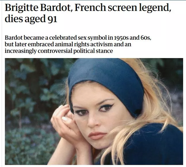 Πλήρης ημερών, σε ηλικία 91 ετών, πέθανε η Γαλλία ηθοποιός και τραγουδίστρια, Μπριζίτ Μπαρντό, η οποία είχε αποχωρήσει από την κινηματογραφική βιομηχανία για να γίνει ακτιβίστρια για τα δικαιώματα των ζώων.