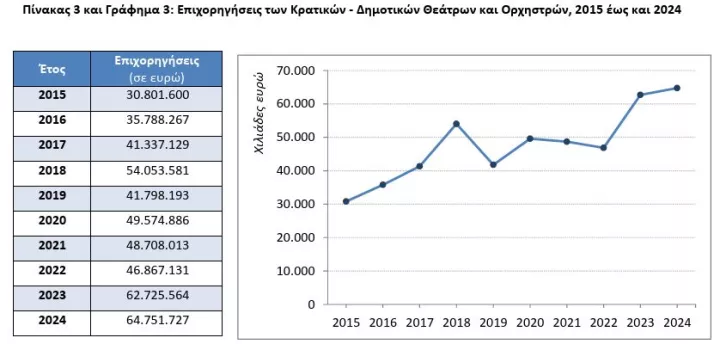 Για να μιλήσουμε με αριθμούς, οι συνολικές επιχορηγήσεις την περίοδο 2023/24 ανήλθαν σε συνολικά 64.751.727 ευρώ, παρουσιάζοντας αύξηση κατά 3,2% σε σύγκριση με την αντίστοιχη χρονική περίοδο του 2023. Από τον παρακάτω πίνακα προκύπτει ότι συγκριτικά με το 2015, οι επιχορηγήσεις διπλασιάστηκαν, σημαντική ήταν επίσης η αύξηση που κατέγραψαν το 2023 (62.725.564) συγκριτικά με το 2022 (46.867.131).