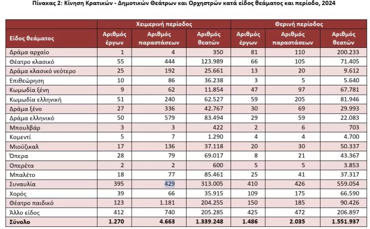 Με μία ευρύτερη εικόνα, συνολικά 2.891.185 θεατές παρευρέθηκαν σε 6.698 παραστάσεις 2.756 έργων κρατικών δημοτικών - θεάτρων και ορχηστρών κατά την περίοδο 2023-24. Η δραστηριότητα των κρατικών - δημοτικών θεάτρων και ορχηστρών ανήλθε σε 2.756 έργα, σε 6.698 παραστάσεις και σε 2.891.185 θεατές, σημειώνοντας αύξηση κατά 22,3% στον αριθμό των έργων, κατά 27,8% στον αριθμό των παραστάσεων και κατά 21,2% στον αριθμό των θεατών σε σύγκριση με το θεατρικό έτος 2022-2023.