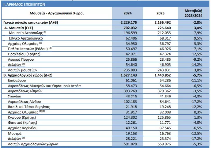 Στους αρχαιολογικούς χώρους, κατά το δεκάμηνο Ιανουαρίου – Οκτωβρίου 2025 σε σχέση με την αντίστοιχη περίοδο του έτους 2024, παρατηρείται μείωση κατά 4,9% στον αριθμό επισκεπτών, αύξηση κατά 6,1% στους επισκέπτες ελευθέρας εισόδου και κατά 41,3% στις αντίστοιχες εισπράξεις.