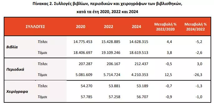Όσον αφορά στις συλλογές βιβλίων, περιοδικών και χειρογράφων, κατά τη σύγκριση του έτους 2024 με το 2022 παρουσιάζεται μείωση κατά 5,2% στους τίτλους (14.628.315) και κατά 2,6% στους τόμους των βιβλίων (18.619.513), αύξηση κατά 3,0% στους τίτλους (212.437) και μείωση κατά 26,3% στους τόμους (4.210.353) των περιοδικών, καθώς και μείωση κατά 1,3% στους τίτλους (53.189) και κατά 1,0% στους τόμους (56.707) των χειρογράφων.