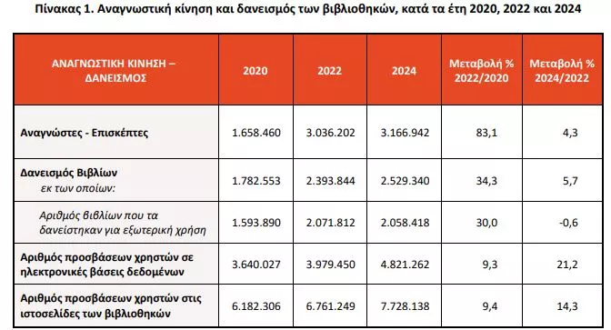 Κατά τη σύγκριση του έτους 2024 με το 2022 παρατηρείται αύξηση κατά 4,3% στον αριθμό των αναγνωστών - επισκεπτών (3.166.942), κατά 5,7% στον αριθμό των δανεισθέντων βιβλίων (2.529.340), ενώ μείωση κατά 0,6% παρατηρείται στον δανεισμό βιβλίων (2.058.418) για εξωτερική χρήση. Αύξηση κατά 21,2% παρατηρείται στον αριθμό προσβάσεων χρηστών σε ηλεκτρονικές βάσεις δεδομένων (4.821.262) και κατά 14,3% στον αριθμό προσβάσεων χρηστών στις ιστοσελίδες των βιβλιοθηκών (7.728.138).