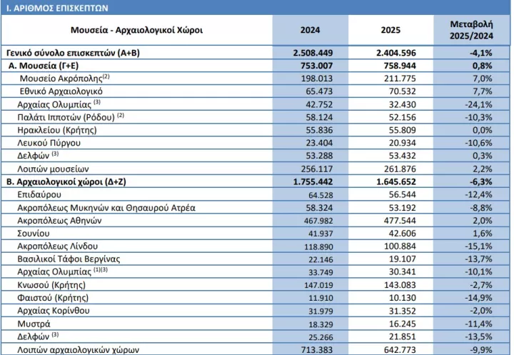 Στους αρχαιολογικούς χώρους, κατά το εννεάμηνο Ιανουαρίου - Σεπτεμβρίου 2025 σε σχέση με την αντίστοιχη περίοδο του έτους 2024, παρατηρείται μείωση κατά 4,8% στον αριθμό επισκεπτών, αύξηση κατά 5,9% στους επισκέπτες ελεύθερης εισόδου και κατά 40,8% στις αντίστοιχες εισπράξεις.