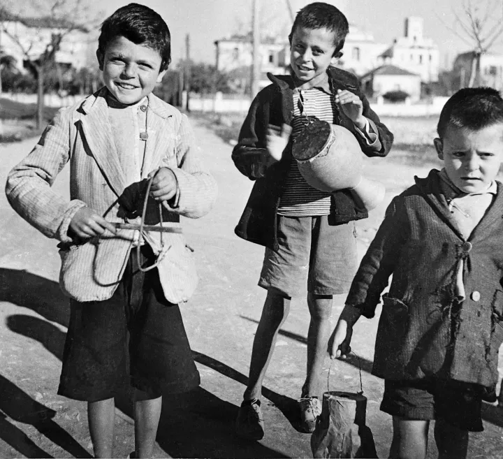 Τα παιδιά καταλαμβάνουν μεγάλο μέρος του corpus έργου της φωτογράφου Βούλας Παπαϊωάννου (1898-1990) και δεν ηδύνατο να μην απαθανάτιζε τη στιγμή κατα την οποία κρατούν μουσικά όργανα για να «ντύσουν» την ερμηνεία τους. Τραβηγμένη το διάστημα μεταξύ 1950-60, η παραπάνω φωτογραφία μας δίνει μία στιγμή κατά την οποία τα δύο εκ των τριών παιδιών κοιτούν τη φωτογραφική μηχανή, χτυπούν το τρίγωνο και το ταμπούρλο, και τραγουδούν, ενώ το άλλο παιδάκι έχει βλέμμα χαμηλό και ανήσυχο, σαν κάτι να το απασχολεί, και κρατά ένα φαναράκι.