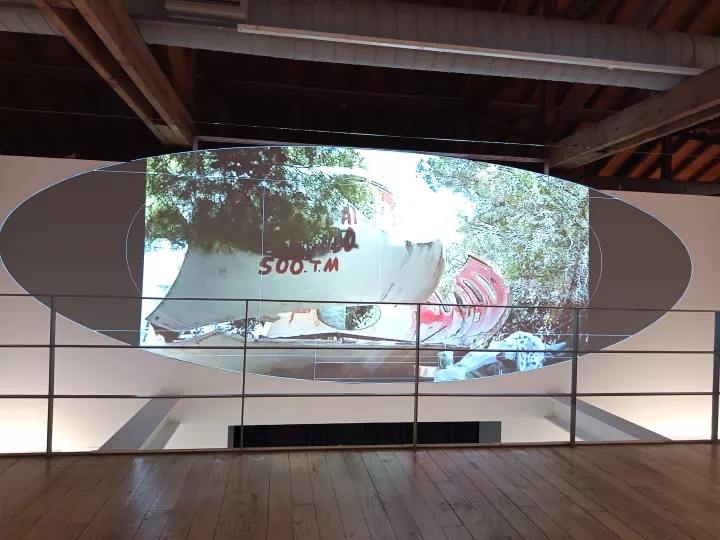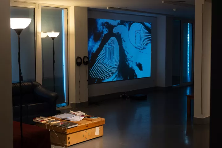 Βιντεοπροβολή που αφορά στα «σπίτια-ufo», στο MOMus-Πειραματικό Κέντρο Τεχνών. Φωτ.: Νεκταρία Μαραγιάννη