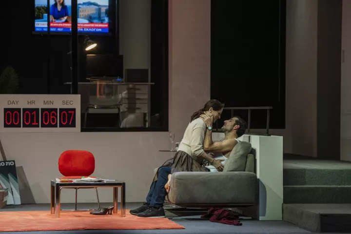 Με τον Νίκο Κουρή και την Καρυοφυλλιά Καραμπέτη στους ρόλους του Οιδίποδα και της Ιοκάστης, τον Λάζαρο Γεωργακόπουλο ως Κρέοντα και τη Ράνια Οικονομίδου ως Μερόπη (ένα πρόσωπο που εισάγει ο Άικ στο έργο) αλλά και τους Κώστα Νικούλι, Σωκράτη Πατσίκα, Τάκη Σακελλαρίου, Χαρά Γιώτα, Γιώργο Ζιάκα, Γιάννη Τσουμαράκη και Δανάη-Αρσενία Φιλίδου να συγκροτούν ένα τραπέζι μιας οικογενειακής και πολιτικής συνάθροισης που εκτρέπεται οριστικά. Σε μετάφραση στα ελληνικά από τον Νίκο Χατζόπουλο, σκηνοθετική επιμέλεια ελληνικής παραγωγής τη Lizzie Manwaring και συνεργάτη σκηνοθέτη για την ελληνική εκδοχή τον Πρόδρομο Τσινικόρη, φορτισμένη με πολιτική, κοινωνική και υπαρξιακή ένταση, μια ηλεκτρισμένη εκδοχή του μύθου του Οιδίποδα.
