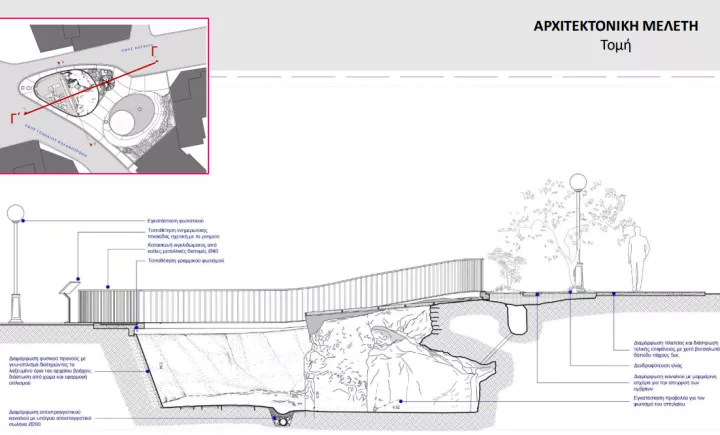 Το έργο περιλαμβάνει την διαμόρφωση νέας πλατείας, στην οποία θα ενσωματώνεται ο αρχαιολογικός χώρος, με την αξιοποίηση του όμορου οικοπέδου, ώστε να εξασφαλίζεται ένας ευχάριστος, λειτουργικός και ποιοτικός δημόσιος χώρος περιπάτου και πρασίνου για τη γειτονιά και τον επισκέπτη.