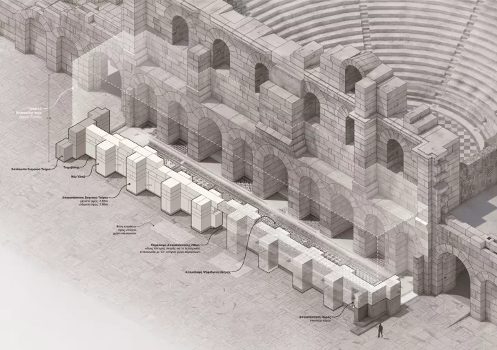 Οι μελέτες περιλαμβάνουν, επίσης, την εγκατάσταση ενός νέου, αυτοτελούς και ημικυκλικού φορέα φωτισμού και υποστήριξης, που αντικαθιστά τα υπάρχοντα ικριώματα, συνδυάζοντας αισθητική εναρμόνιση με το μνημείο και ορθολογική οργάνωση φωτισμού. Παράλληλα, προβλέπεται πλήρης αναβάθμιση των υποδομών ύδρευσης και σύνδεση με τα καμαρίνια και τους χώρους υγιεινής του Ηρωδείου, ενώ το εξωτερικό δίκτυο αποχέτευσης θα ανακατασκευαστεί πλήρως.