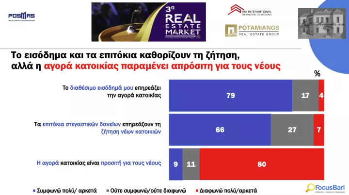 Τα νούμερα δε λένε ψέματα αλλά μπορούν και να μπερδέψουν, η αγορά κατοικίας επηρεάζεται από το διαθέσιμο εισόδημα στο 80% των πολιτών και το 65% εξετάζει και τα επιτόκια των στεγαστικών δανείων και κάτι λιγότερο από 10% θεωρεί ότι η αγορά κατοικίας είναι προσιτή στους νέους. Θυμίζω και οφείλω να τονίσω ότι είναι πανελλαδική έρευνα και δε περιορίζεται μόνο στα μεγάλα αστικά κέντρα.