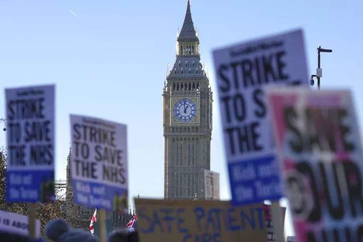 Νοσηλευτές συμμετέχουν σε διαμαρτυρία έξω από το νοσοκομείο St. Thomas’ στο Λονδίνο, στις 15 Δεκεμβρίου 2022. Πρόκειται για τη μεγαλύτερη απεργία στην ιστορία του Royal College of Nursing, με έως και 100.000 μέλη να αποχωρούν από 65 οργανισμούς του NHS. (AP Photo/Kin Cheung)