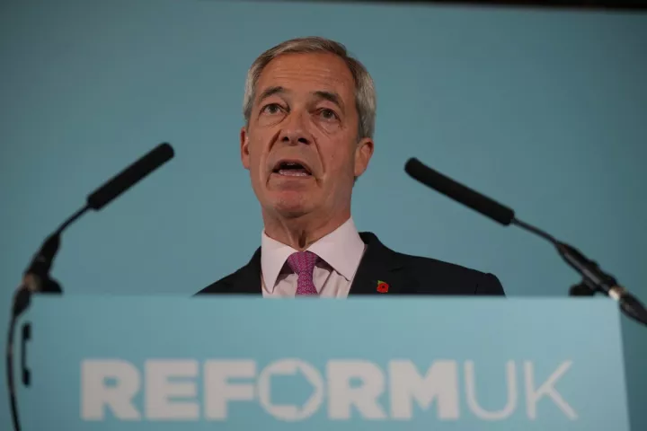 Ο Νάιτζελ Φάρατζ μιλά κατά τη διάρκεια συνέντευξης Τύπου στο Λονδίνο, τη Δευτέρα 27 Οκτωβρίου 2025. (AP Photo/Kin Cheung)