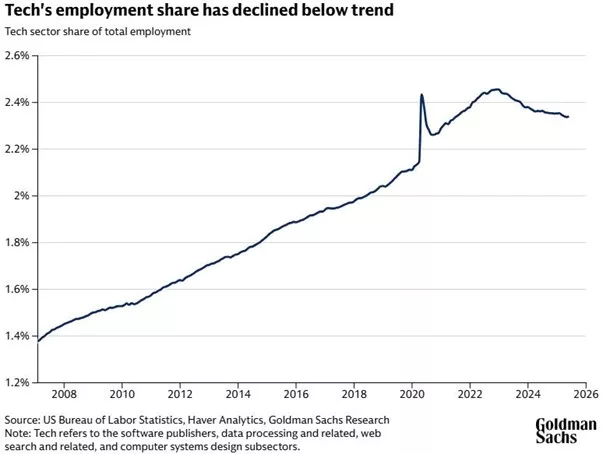 Ο τεχνολογικός τομέας σήμερα αντιστοιχεί περίπου στο 2,3% της συνολικής απασχόλησης στις ΗΠΑ – το χαμηλότερο ποσοστό από τις αρχές του 2021. Το ποσοστό αυτό κορυφώθηκε γύρω από την κυκλοφορία του ChatGPT τον Νοέμβριο του 2022 και έκτοτε μειώνεται. Μόνο σε υποδομές πληροφορικής, data processing, web hosting και computer systems design χάθηκαν περίπου 91.000 θέσεις εργασίας. Οι αγγελίες για software developers έχουν μειωθεί κατά 71% από το υψηλό του 2022 και βρίσκονται 33% κάτω από τα προ-πανδημικά επίπεδα.
