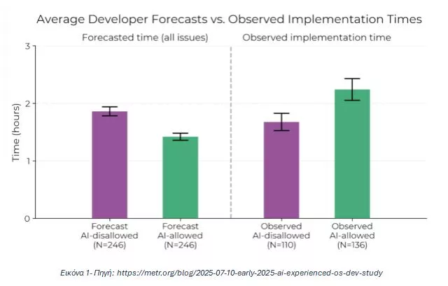 Μάλιστα, μια πραγματική πειραματική μελέτη της METR (σε έμπειρους προγραμματιστές ανοικτού κώδικα, σε πραγματικά tasks) διαπίστωσε ότι όταν επιτράπηκε η χρήση εργαλείων ΤΝ, οι συμμετέχοντες χρειάστηκαν 19% περισσότερο χρόνο για να ολοκληρώσουν τις εργασίες τους - ενώ οι ίδιοι πίστευαν ότι είχαν επιταχύνει κατά 20%.