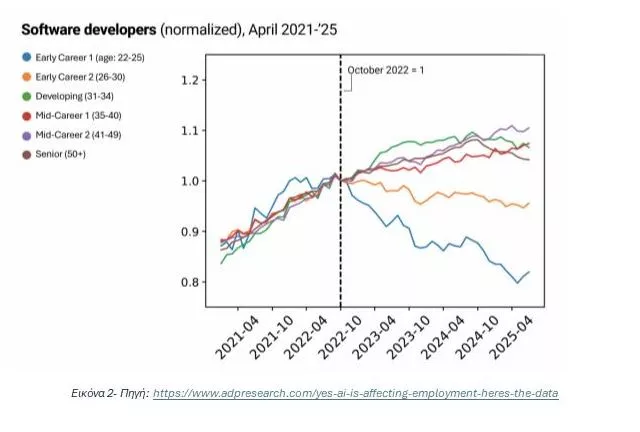 Υπάρχουν σχετικά δεδομένα: working paper/αναφορά του Stanford Digital Economy Lab («Canaries in the Coal Mine?») δείχνει ότι σε ρόλους με υψηλή «έκθεση» στην ΤΝ, η απασχόληση της κατηγορίας 22–25 ετών έχει πιεστεί σε σχέση με μεγαλύτερες ηλικίες, όπως φαίνεται και στο παρακάτω διάγραμμα: