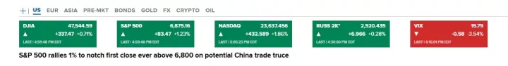 Ο S&P 500 έκλεισε με άνοδο 1,23% στις 6.875,16 μονάδες, ενώ και ο Nasdaq τερμάτισε τις συναλλαγές του με κέρδη 1,86% στις 23.637,45 μονάδες, υποστηριζόμενος από την άνοδο της Nvidia και άλλων μετοχών εταιρειών παραγωγής μικροεπεξεργαστών. Ο Dow Jones έκλεισε επίσης με κέρδη 0,71% στις 47.544,59 μονάδες. Και οι τρεις κύριοι δείκτες σημείωσαν νέα ιστορικά υψηλά κατά τη διάρκεια της συνεδρίασης.