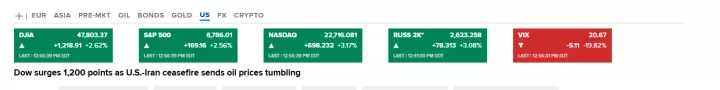 Μεγάλη άνοδο, άνω του 2,5%, καταγράφουν οι βασικοί δείκτες στο Χρηματιστήριο της Νέας Υόρκης μετά τη δήλωση του προέδρου των ΗΠΑ, Ντόναλντ Τραμπ για εκεχειρία δύο εβδομάδων με το Ιράν. Με τον τρόπο αυτό «πάγωσε» μια σύγκρουση πέντε εβδομάδων που είχε κλείσει μια κρίσιμη θαλάσσια οδό για τον παγκόσμιο ενεργειακό εφοδιασμό και είχε προκαλέσει αναταραχή στις τιμές των μετοχών.
