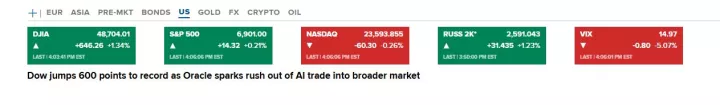 Ο βιομηχανικός δείκτης Dow Jones Industrial Average έκλεισε με κέρδη 1,34%, στις 48.704,01 μονάδες, φθάνοντας σε νέα υψηλά επίπεδα την Πέμπτη, ωθούμενος από την μετοχή της Visa, μετά την αναβάθμιση της μετοχής από την Bank of America.
